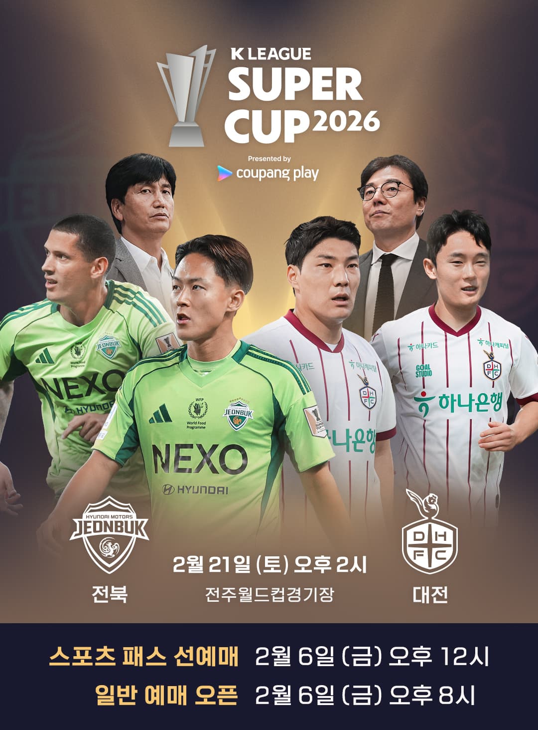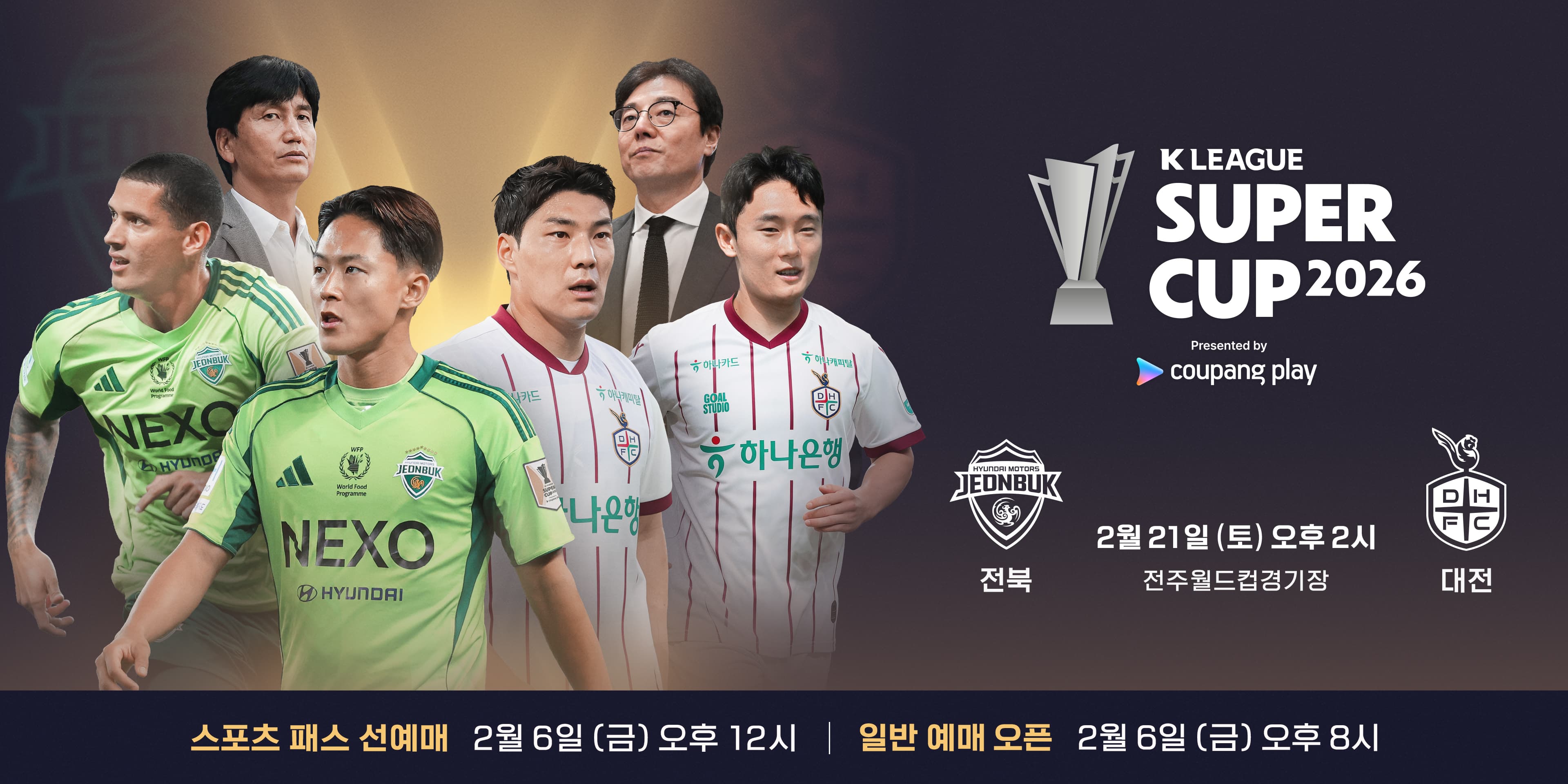 '쿠팡플레이 K리그 슈퍼컵 2026'은 쿠팡 와우회원 혹은 스포츠 패스 가입자만 예매 가능하며, 스포츠 패스 가입자에게는 선예매 혜택이 제공됩니다.